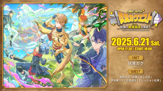 今年デビュー7周年を迎えた伏見ガクが、ファン待望の初ソロイベントを開催します。コンセプトは 「“伝説の調理器具”を手に入れ世界一美味しい料理を作ることを目指し、仲間たちと様々な試練を乗り越えていく」というもので、ロールプレイングゲームの世界観を取り入れています。伏見ガクと壮大な旅を共にする個性豊かな仲間たちとして、剣持刀也、社築、ましろ爻、宇佐美リトがゲスト出演し、ナレーションを北見遊征が務めます。また、イベント開催に先立ち、彼らとの出会いと旅への出発までを描いた「序章」動画がYouTube(https://youtu.be/9ULWJshxPfs)にて公開中です。