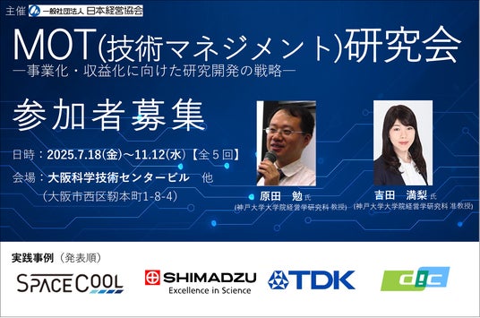 一般社団法人日本経営協会(本部事務局:東京都渋谷区 会長:高原 豪久)は、技術・研究開発部門を対象に、技術マネジメントの実践事例を学ぶことを目的として開催する『MOT(技術マネジメント)研究会』の第17期(2025年7月18日~11月12日:全5回開催)受講生の募集を開始いたしました。