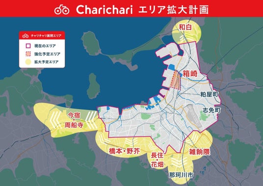 なお、福岡エリア(福岡市・志免町・粕屋町・那珂川市)における利用可能エリアの拡大時期については、改めてホームページ等によりお知らせいたします。