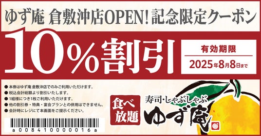 これを記念して、2025年8月8日(金)までご利用いただける『寿司・しゃぶしゃぶ ゆず庵倉敷沖店』限定のwebクーポンを配布します。