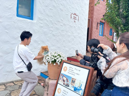 講義の後は、志摩地中海村の美しい街並みを舞台に、実際の撮影実習を実施しました。金婚式を迎えたご夫婦や、愛犬と一緒に参加されたご夫婦の姿もあり、浅田さんは一組一組に丁寧に声をかけながら、構図やポーズのアドバイスを行いました。長年家族写真を撮り続けてきた浅田さんならではの、ユーモアと温かみのあるポーズ提案も随所に見られ、思わず笑ってしまうようなシーンが何度も生まれ、撮影会は終始なごやかな雰囲気に包まれていました。