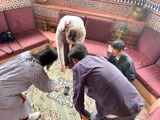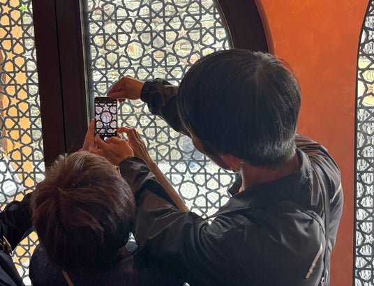 装飾が美しいアーチ天井のあるスポットでは、スマートフォンを床に置き、インカメラで上から覗き込むというユニークな構図を提案。普段とは異なる発想に、驚きと笑顔がこぼれました。ほかにも、空とのバランスを意識した広角での俯瞰撮影、格子越しにピントを合わせるテクニック、模様の美しい床を活かしたアングルなど、日常では気づきにくい視点を取り入れた撮影方法が紹介され、参加者からは「こんな写真が撮れるなんて」と歓声があがる場面もありました。