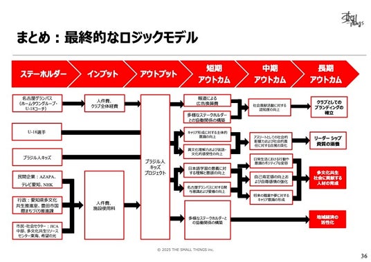 「今回の実証実験では、名古屋グランパスU-18選手と在留ブラジル人の子どもたちが主体となり、スポーツを通じた共創により多文化共生を含む社会課題解決に向けた可能性を示しました。SROIを用いて、本プロジェクトから生まれたアウトカム(成果)を貨幣価値に換算し、その社会的価値を可視化するとともに、これらの成果に関するエビデンスを示しています。