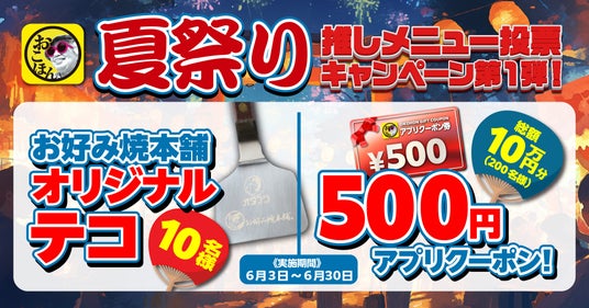 株式会社物語コーポレーション(本社:愛知県豊橋市/代表取締役社長:加藤 央之)は、全国20店舗展開中の『お好み焼本舗』(以下、おこほん)で、夏期間限定メニュー「おこほん夏祭り」を販売いたします。これを記念して、2025年6月3日(火)より、「お好み焼本舗公式アプリ」にて、「推しメニュー投票キャンペーン」を開催いたします。
