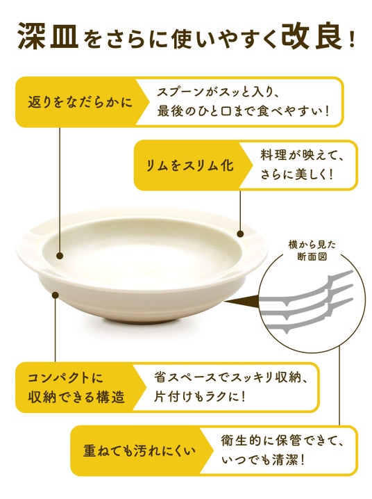 第2弾では、「SUKUSUKU」の特長である「返し」をなだらかにすることで、最期のひと口まで食べやすいようにし、「リム」はスリム化して中の料理が映えるように改良しました。また、深皿だけではなく、今回新たに設けた平皿もすくいやすさを追求したデザインになっています。また、底の形状も変更することで、同じサイズのお皿はスタッキングしてコンパクトに収納することが可能になりました。
