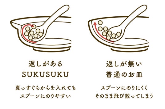 「SUKUSUKU」は「すくいやすい」×「すくすく育つ」という2つの意味を込めて開発された食育用食器です。「SUKUSUKU」は、子育ての悩みの中から生まれました。こどもは1歳を過ぎて来ると、食事も手掴みから徐々にスプーンの練習が始まります。ただ、こどもにとって、スプーンを使って上手く食べ物をすくうのは難しいもの。そこで「SUKUSUKU」は器の上部に「返し」を設けることで、握りながらしかスプーンが使えなくても、お皿のカーブに沿って自然と食べ物をすくえるような形状になっています。また、器の上部に返しがあるため、勢い余って食べ物を飛び散らせる事も減ります。他に、こどもの食事で頭を悩ませるのが「食べこぼし」です。「SUKUSUKU」では、食器のリムを広めにつくることでテーブルに食べこぼしが落ちにくいように工夫しています。「すくいやすいお皿」を通して、食に興味を持ち、自分でどんどん挑戦する好奇心を育んでほしい。「SUKUSUKU」は、こうしたこどもへの願いが込められた商品となっています。