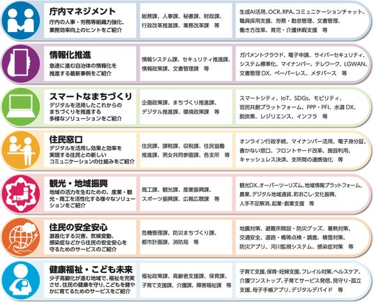 自治体業務全般を網羅する7つの展示分野に、100社・団体を超える出展者が一堂に集まります。