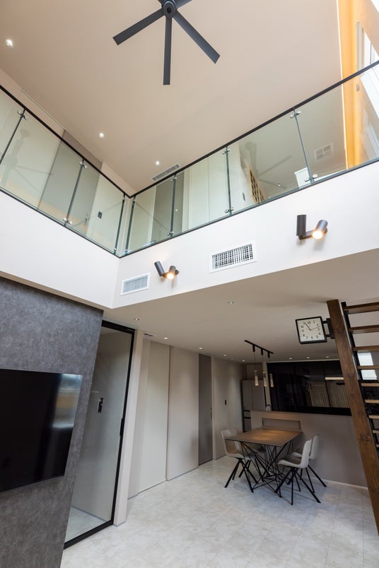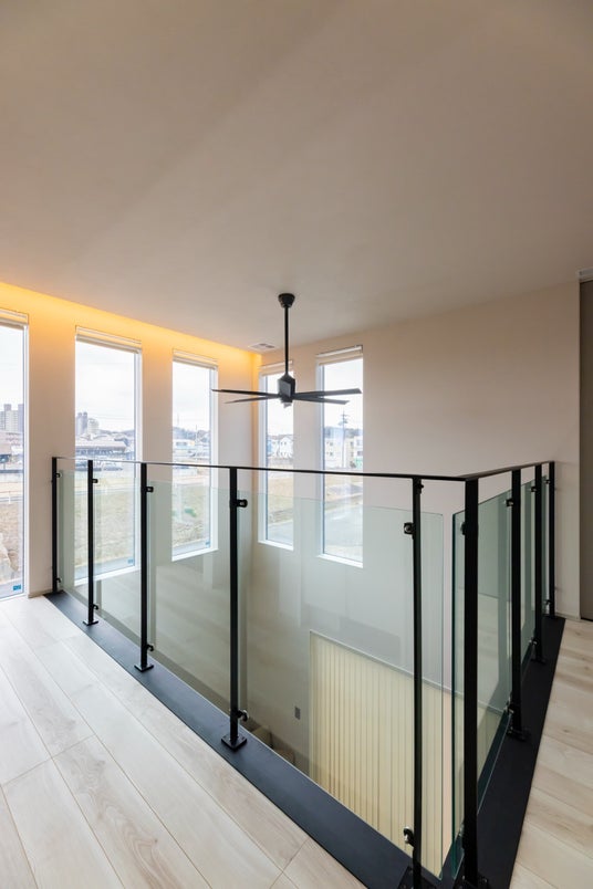 全館空調「マッハシステム」を搭載したからこそ可能になった広々とした吹き抜けには、ガラスパネルを使用しより開放的な空間に。キッチン背面収納やSICと玄関ホールの動線など、生活感を隠すための工夫をたくさん施したおしゃれなお家です。