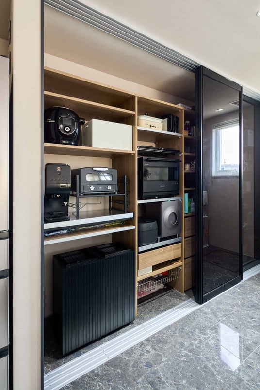 電子レンジやコーヒーメーカーなどのキッチン用品はすべて背面に収納し、引き戸を閉じればキッチンがスッキリと見える仕様に。引き戸のパネルは締め色のブラックを採用することで、空間のアクセントにもなっています。