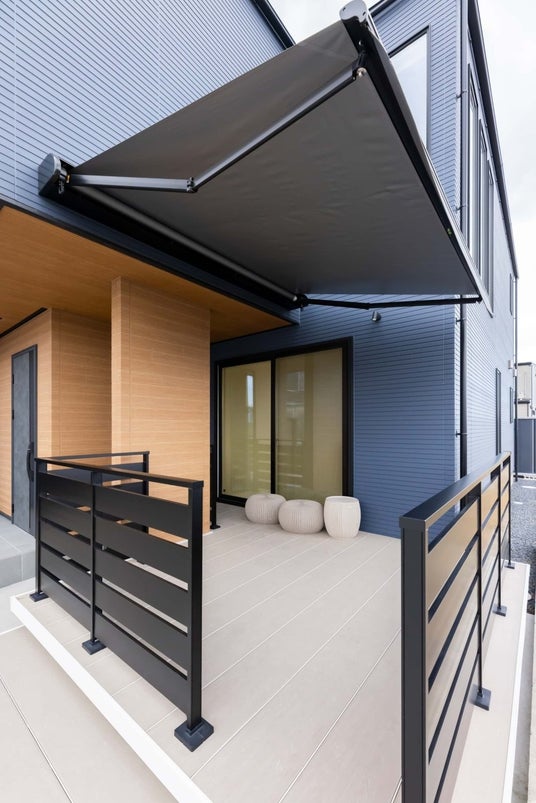 リビングからも駐車場からもアクセスできるウッドデッキは、天候に左右されない折りたたみ屋根を取り付けることで家族の時間をより楽しく快適にします。