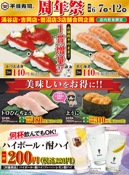 回転寿司のパイオニア「平禄寿司」では6月に周年日を迎える宮城県の3店舗、涌谷店・吉岡店・岩沼店にて6月7日(土)から12日(木)まで「周年祭」を開催いたします。トロびんちょう、上うにを「特別価格」にて、また、かつお赤身、蒸し海老は、それぞれ1貫増量の3貫で提供いたします。ドリンクではハイボール、酎ハイも「周年祭価格」にてお楽しみいただけます。お客様への感謝の意をこめた特別な6日間、皆様のご来店をスタッフ一同お待ちしております。