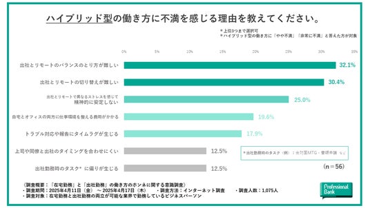 次いで、『出社とリモートで異なるストレスを感じて精神的に安定しない(25.0%)』『自宅とオフィスの両方に仕事環境を整える費用がかかる(19.6%)』『トラブル対応や報告にタイムラグが生じる(17.9%)』と続きました。