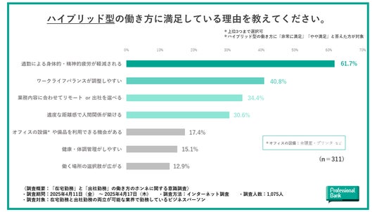ハイブリッド型勤務者で、現在の働き方に『非常に満足』『やや満足』と回答したビジネスパーソンを対象に、満足している理由を聞きました。