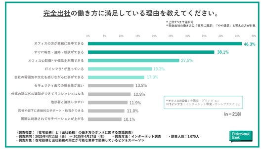 完全出社勤務者で、現在の働き方に『非常に満足』『やや満足』と回答したビジネスパーソンを対象に、満足している理由を聞きました。