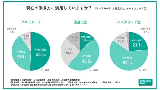 まず、現在の働き方(フルリモート or 完全出社 or ハイブリッド型)に満足しているかを聞きました。