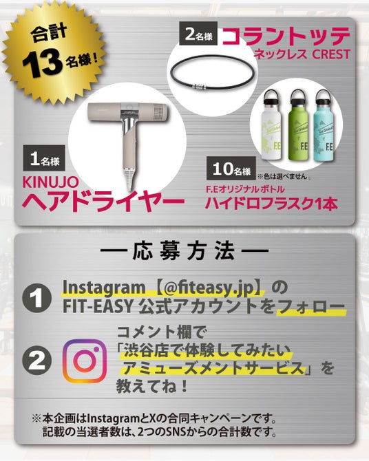全国にアミューズメントフィットネスクラブを運営するフィットイージー株式会社(本社:岐阜県)は、「旗艦店」である「FIT-EASY渋谷店」を2025年7月24日(木)にプレオープン、8月5日(火)にグランドオープンいたします。 これを記念し、日頃のご愛顧に感謝を込めて、XとInstagramにてSNS合同キャンペーンを実施いたします。 抽選で豪華プレゼントが当選する本キャンペーンには、どなたでもご応募いただけますので、皆様ぜひともご参加ください。