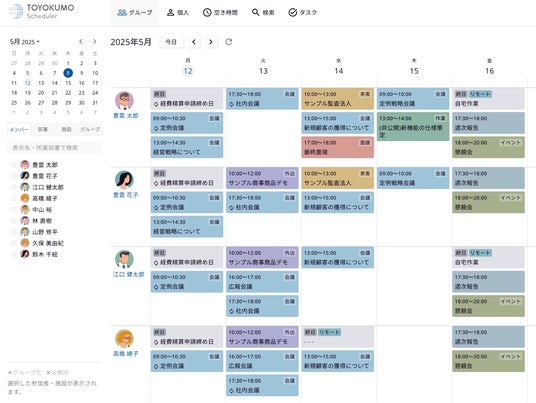 これらの普遍的な課題を解決すべく、専門知識がなくてもカンタンに使えるスケジュール管理ツール「トヨクモ スケジューラー」のUIを刷新いたしました。新しいUIは、「グループ利用の快適さ」を徹底的に追求し、チーム全体の予定がグラフィカルなカレンダー上で一目で把握可能に。これにより、従来、複数メンバーの空き時間確認に費やしていた時間は劇的に短縮されます。