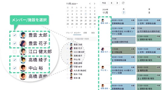 多様な働き方が進む現代においてメンバーがどこにいても、グループ全体の予定がグラフィカルなカレンダー上で一目で把握可能になり、複数メンバーや施設・共有備品の予定をわずか数クリックで登録・変更できます。これにより、社内外のあらゆる予定の調整や管理に関連する業務の効率を飛躍的に向上させます。