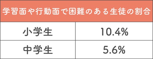実際、文部科学省の調査によると、通常学級に在籍する小学生の約10.4%が、知的な遅れはないものの、学習面や行動面で困難を抱えているとされています。(出典 : 文部科学省『通常の学級に在籍する特別な教育的支援を必要とする児童生徒に関する調査』)