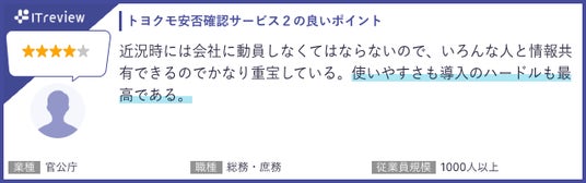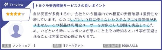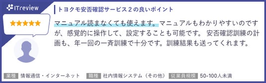 なお、安否確認サービス2の導入によって「ワンクリックで安否確認用メッセージが送信できるようになり、業務が大幅に効率化された」「休日の地震でも従業員の回答状況をすぐに確認できて助かった」など、多くのユーザーから高評価の声が寄せられています。