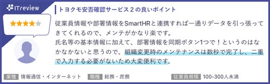 「すべての人を非効率な仕事から解放する」をミッションに掲げ、ビジネス向けクラウドサービスを提供するトヨクモ株式会社(本社:東京都品川区、代表取締役社長:山本 裕次、以下トヨクモ)は、法人向け安否確認システム 「安否確認サービス2」 が、国内最大級の IT製品レビューサイト ITreview が選出する 「ITreview Best Software in Japan 2025」 において36位にランクインしたことをお知らせします。13,000を超える製品・サービスが掲載される中で、災害対策ツールとして数少ない Top100入りを果たしました。