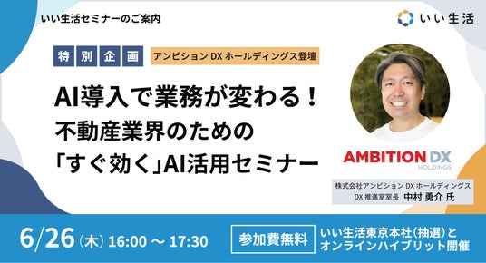 不動産業務を網羅するバーティカルSaaSと業務効率を推進するBPaaS(※1)で不動産市場のDXを推進する株式会社いい生活(東京都港区、代表取締役社長 CEO:前野 善一、東証スタンダード:3796、以下:いい生活)は、6月26日(木)16時から「AI導入で業務が変わる!不動産業界のための「すぐ効く」AI活用セミナー」を開催いたします。