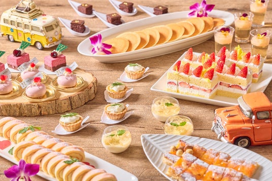 ストロベリーショートケーキ/白桃ムース/アメリカンチェリームース/パッションフルーツのタルトレット/マンゴーのバトンパイ/桃のパンナコッタ/桃のジュレ/チョコレートブラウニー/白桃のロールケーキ/パンケーキ(ベリーソース / チョコソース / ホイップクリーム)/カラフルストーンアイス(6種のフレーバーアイスクリーム/8種のトッピング)