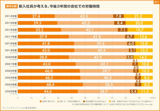 結果、2025年度に「定時に帰りたい」と回答した割合は、11年前の2014年度の新入社員と比較すると、17.2ポイント高くなりました。また、「仕事・成長のためにできるだけたくさん働きたい」と回答した割合は、昨年より3.1ポイント増加したものの、2025年度では11.3%と、2014年度の21.2%から半数近く減少しました(図6)。