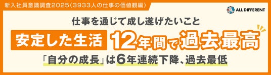 累計20,000社420万人以上の組織開発・人材育成を支援するALL DIFFERENT(オールディファレント)株式会社(所在地:東京都千代田区 代表取締役社長:眞崎大輔)および「人と組織の未来創り(R)」に関する調査・研究を行うラーニングイノベーション総合研究所(R)は、2025年3月25日~4月24日の期間で、2025年度入社の新入社員 3,933人を対象に「新入社員意識調査」を行いました。本リリースでは、4月に入社を迎えた新入社員の仕事への価値観に関する調査結果を公表いたします。