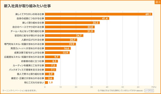次に、今後どのような仕事に取り組んでいきたいか質問しました。結果、「楽しくてやりがいのある仕事」と回答した割合が69.1%となり、他項目より突出した結果になりました。次に、「自身の成長につながる仕事」が41.4%、「楽しく取り組める仕事」が35.3%と続きました(図3)。