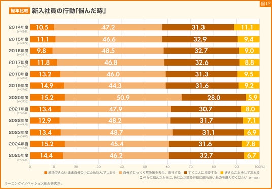 悩んだときの行動について、2014年度から12年間、各年度の新入社員が回答した結果を比較しました。結果、「解決できないまま自分の中にため込んでしまう」と回答した割合は低いものの徐々に増加している結果となりました(図12)。