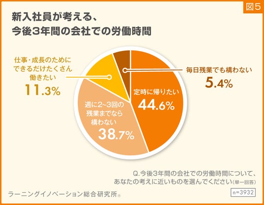 「仕事・成長のためにできるだけたくさん働きたい」と回答した割合は11.3%、「毎日残業でも構わない」と回答した割合は5.4%の結果になりました(図5)。