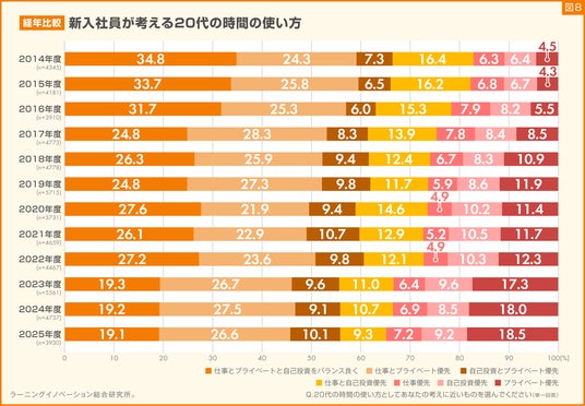 新入社員が考える20代の時間の使い方について、2014年度から12年間、各年度の新入社員が回答した結果を比較しました。特徴的な点を挙げると、「プライベート優先」と回答した新入社員の割合が、2014年度の4.5%から徐々に増加し、2025年度は18.5%と4倍以上の回答割合となりました。特に、2022年度から2023年度にかけて5ポイント増加しています。2022年度から2023年度に入社した新人は、2020年以降の新型コロナウイルス感染拡大後に高校や大学に入学した世代です。様々な制限の中で学生生活を送った経験が、こうした結果につながっていることも考えられます。