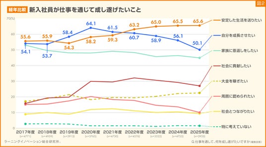新入社員が仕事を通じて成し遂げたいことについて、2017年度から9年間、各年度の新入社員に質問をした結果を比較しました。結果、「安定した生活を送りたい」と回答した新入社員の割合(折れ線グラフのオレンジ色)は、2019年度の54.3%を境に年々増加傾向にあり、2025年度は65.6%と過去最高の割合になりました。