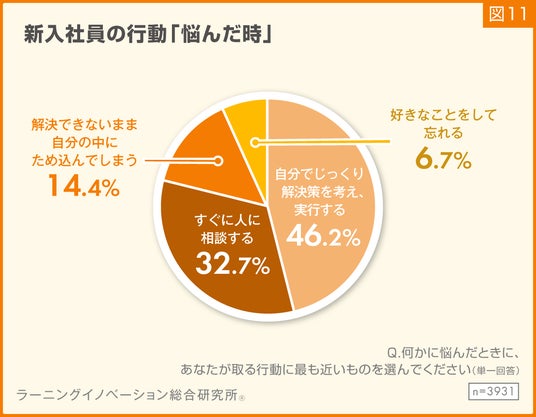 最後に、新入社員が悩んだ時の行動について質問しました。何かに悩んだときに、あなたが取る行動に最も近いものを選んでくださいと質問したところ、「自分でじっくり解決策を考え、実行する」と回答した割合が46.2%となりました。