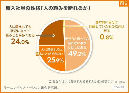 ここからは、新入社員の対人関係における性格について見ていきます。人に頼まれたら断れない性格かどうかを質問したところ、「断ろうと思っても断れない事がしばしばある」と回答した割合が49.2%と約半数でした。次に、「人に頼まれると断ることができない」が25.9%と続きました。2025年度の新入社員は、7割以上の新入社員が何か頼まれた際に断ることを躊躇(ちゅうちょ)する傾向にある性格であることがわかりました(図9)。
