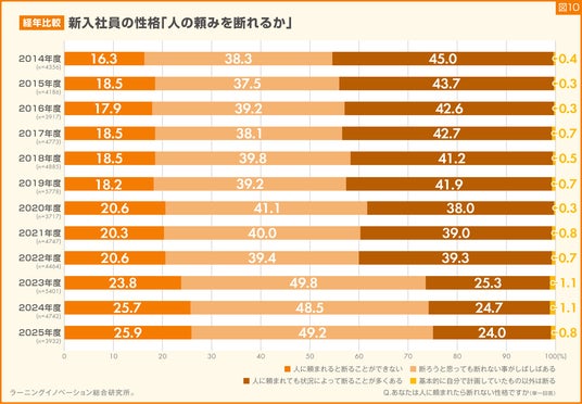 新入社員の対人関係にも、時代の変化があるのでしょうか。人に頼まれたら断れない性格かどうか、2014年度から12年間、各年度の新入社員が回答した結果を比較しました。結果、「人に頼まれると断ることができない」「断ろうと思っても断れない事がしばしばある」と回答した割合は徐々に増加し、「人に頼まれると断れない」割合は2025年度に過去最高の割合となりました。これにより、断れない新入社員の割合が増えていることがわかります(図10)。