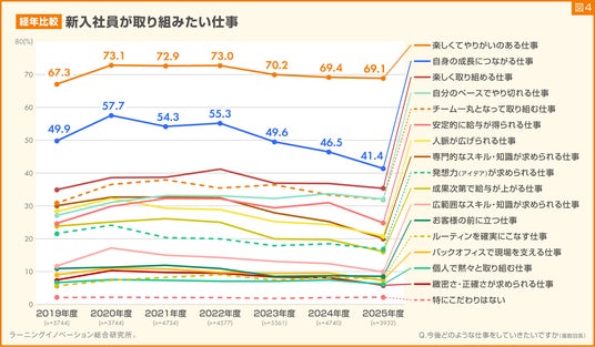 「自身の成長につながる仕事」と回答した割合(折れ線グラフの青色)も7年連続、2位をキープしていましたが、2020年度の57.7%を境に徐々に減少。2025年度は41.4%と過去最低の割合を記録しました(図4)。