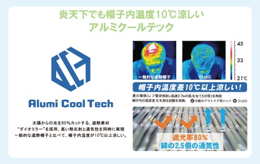 独自構造の「ShaBo アルミクールテック」搭載の遮熱帽子
