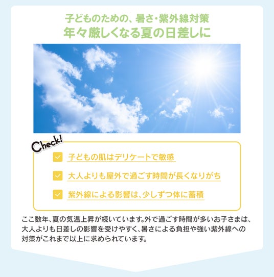 近年、夏の暑さが年々厳しくなる中で、外で過ごす時間が多い子どもは、大人よりも暑さや紫外線の影響を受けやすいと言われています。デリケートな肌を守るためにも、暑さ・紫外線対策がより重要になっています。