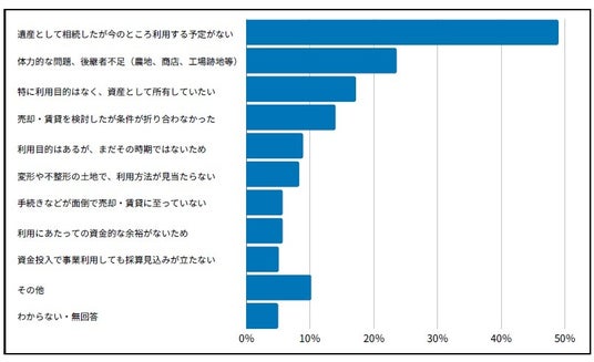 国土交通省が令和5年に発表した土地問題に関する国民の意識調査で「現在利用していない土地は、なぜ利用していないのか」というアンケート調査に対して下記の回答を集めています。