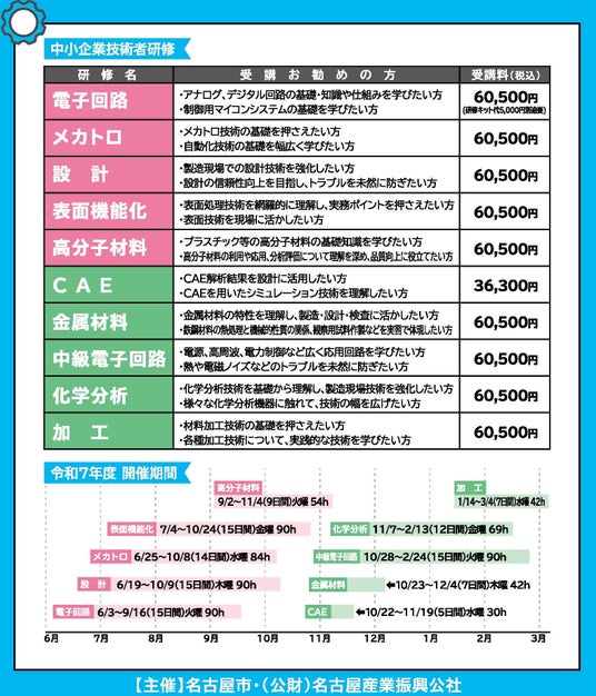 御社の技術者育成をお手伝いします!電子系・機械系・化学系の10コース!名古屋市工業研究所の協力のもと、半世紀以上続く、実績のある実践的研修です!