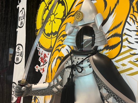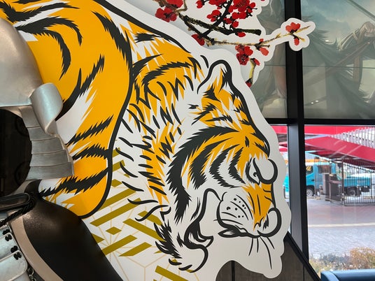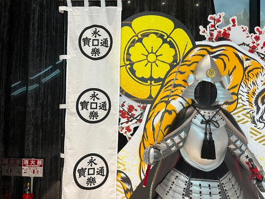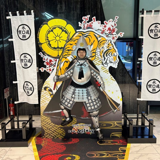 さらに、虎の上部にあしらわれている家紋は織田家の「織田木瓜」(おだもっこう)。パネルの左右に建てられたのぼり旗には信長の時代に流通していた貨幣である「永楽銭」(えいらくせん)をデザイン。信長は「楽市楽座」政策など経済発展にも尽力した武将として有名ですが、永楽銭(永楽通宝)を自らの旗印に使用していました。
