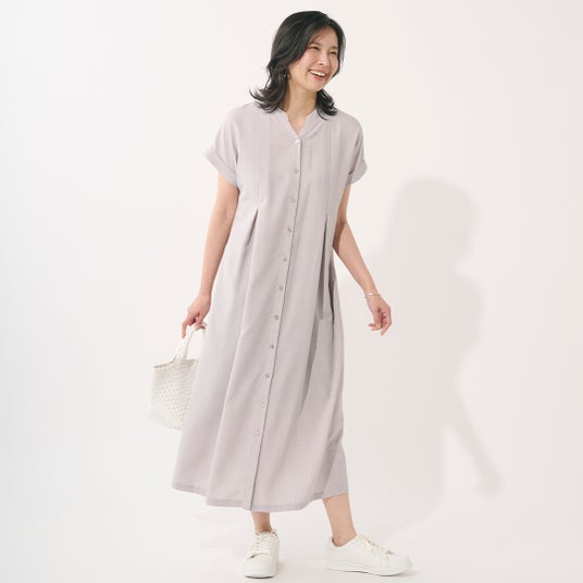 バスト部分のダーツですっきり見せ1枚でもスタイルアップします。共布のベルトをつけると細見えし、より上品な印象に。また、ウエストから広がるタックでフレアシルエットを演出し、ヒップやウエストをさり気なくカバー。顔周りをすっきり見せるキーネックは大人な抜け感をプラスします。