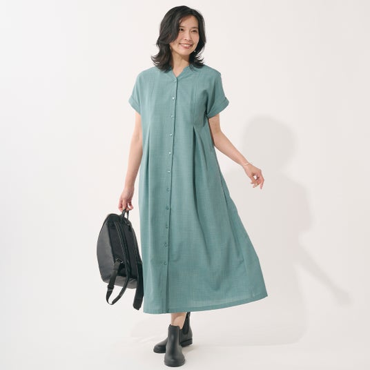 【すごナノ撥水】リネンライクシャツワンピースは、軽くて肌にはりつきにくいリネンライク素材に、防汚撥水・接触冷感・UV機能付きで雨を弾き汚れにくく、汗ジミも防ぎ、梅雨から真夏日まで活躍する1枚。