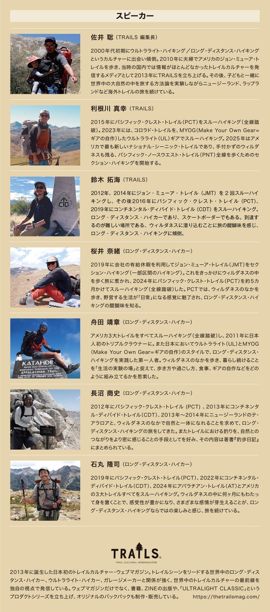 今回の『スピーカーシリーズ』では、さまざまなハイカーたちが登場し、ロング・ディスタンス・ハイキングとウィルダネスについて語ります。