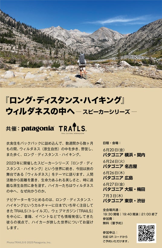 2023年に続き、再びパタゴニアとTRAILSの共催でのスピーカーシリーズ (トークイベント) を、パタゴニアストア全国5店舗で開催します。