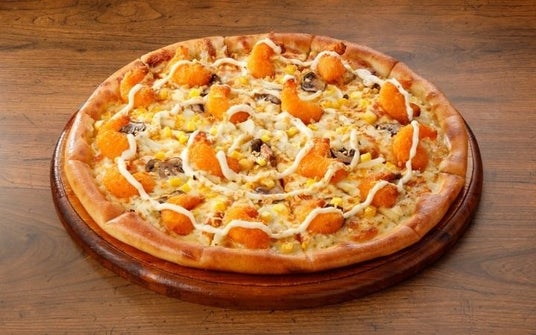 トッピング:ポップコーンシュリンプ、オニオン、マッシュルーム、コーン、フライドガーリック、プレミアムチーズブレンド、エキストラチーズ、タルタルソース