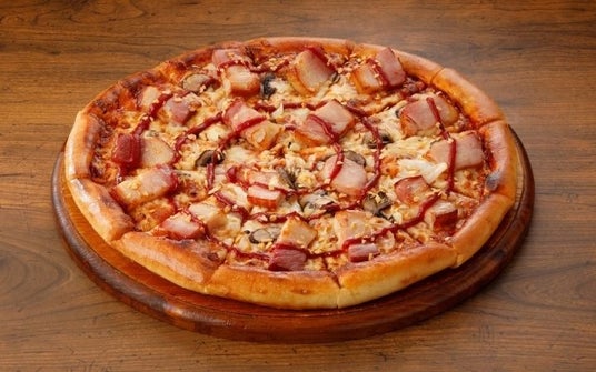 トッピング:厚切りベーコン、オニオン、マッシュルーム、フライドガーリック、プレミアムチーズブレンド、エキストラチーズ、ケチャップ、バーベキューソース