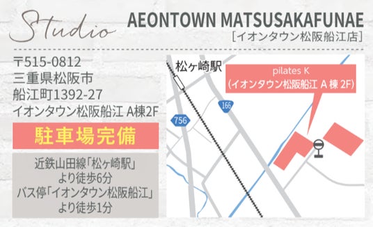 「ピラティスK イオンタウン松阪船江店」は、買い物のついでや仕事・家事の合間にも通いやすい、女性専用のマシンピラティススタジオです。広々とした駐車場が完備されており、車でのアクセスも良好。地域に暮らす女性たちが、日常の延長で“自分のための時間”を気軽に持てる場所です。